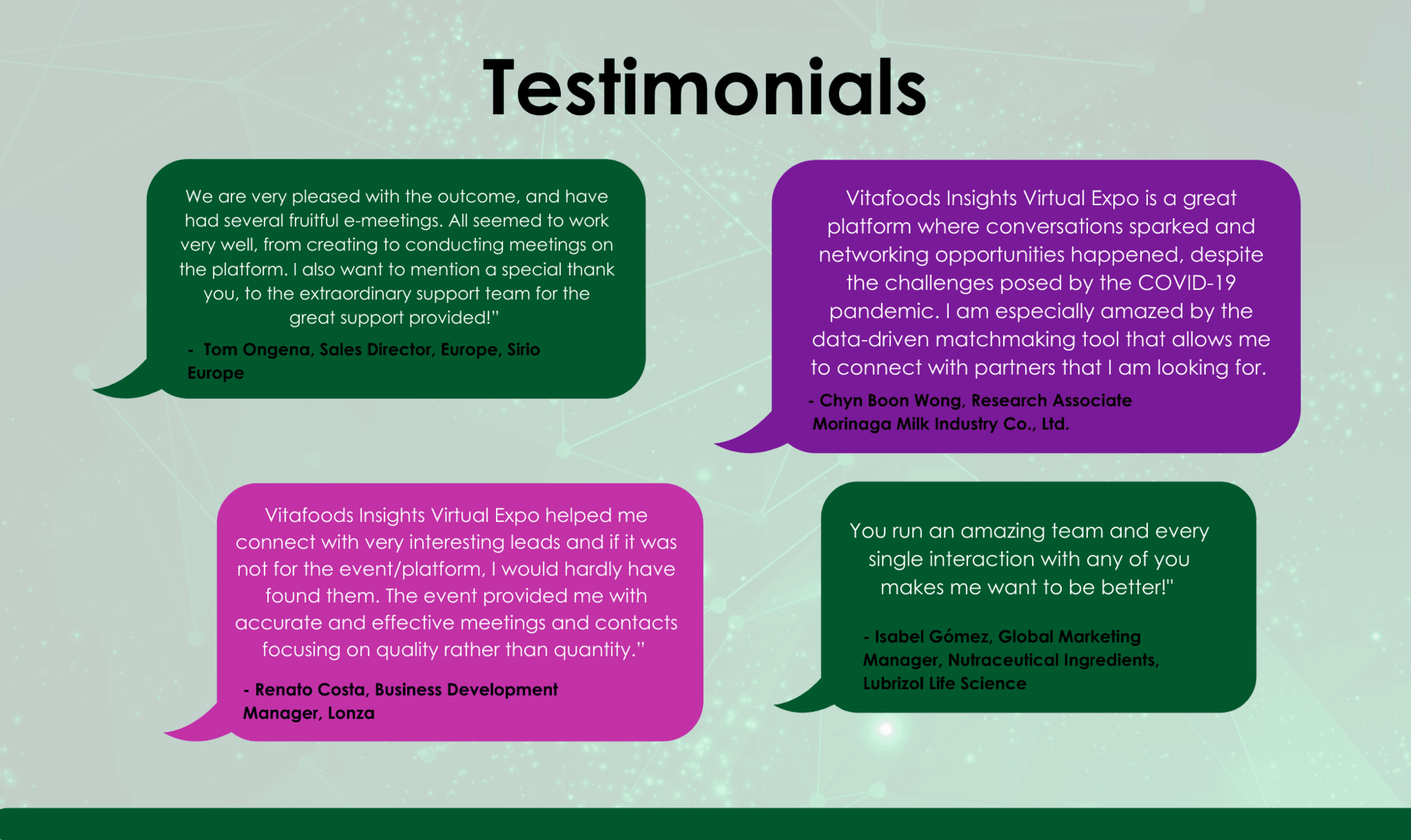 Vitafoods Insights, our knowledge platform, brought the community even closer together this year by launching a brand-new annual event - Vitafoods Insights Virtual Expo. From 10-13 May 2021, nutraceutical professionals exchanged business cards, attended live webinars, panel discussions and more. Based on their profile interest, visitors were matched with exhibitors, guaranteeing meaningful connections.