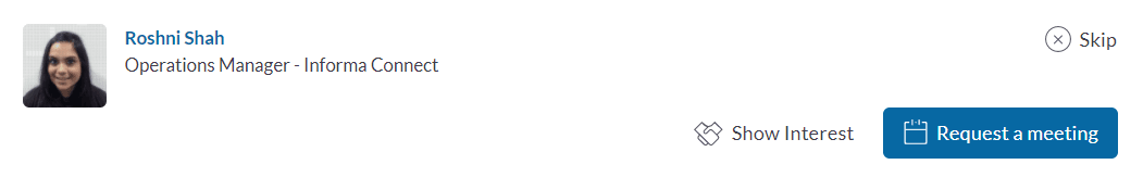 To set up a one-to-one meeting, identify the person you would like to connect with. Click on 'Request a meeting'.